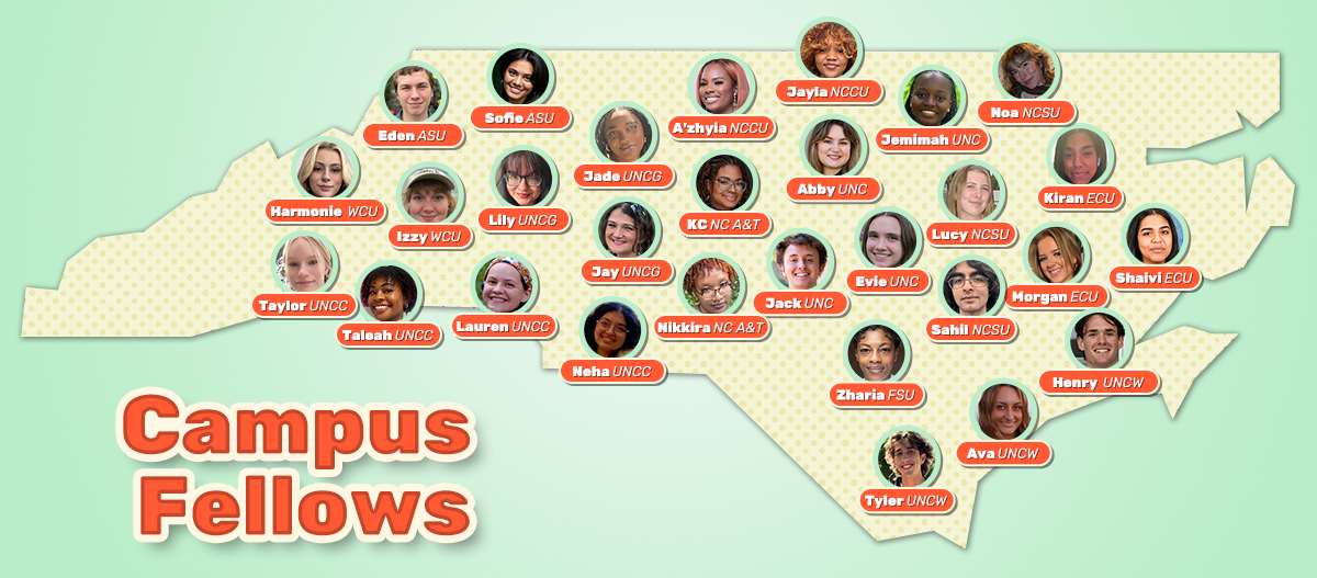 The Campus Fellows program started in January 2022 with four students at four different universities. We have fellows on eleven different campuses, including: UNC-Wilmington, Appalachian State, UNC-Greensboro, NC A&T, UNC, NC Central, NC State, ECU, Fayetteville State, Western Carolina, and UNC Charlotte.